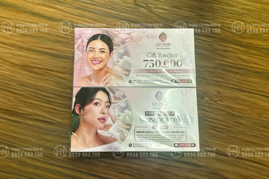 - Cán màng mờ/bóng: Lớp màng bảo vệ giúp voucher bền màu, chống trầy xước và mang lại vẻ sang trọng, chuyên nghiệp hơn.