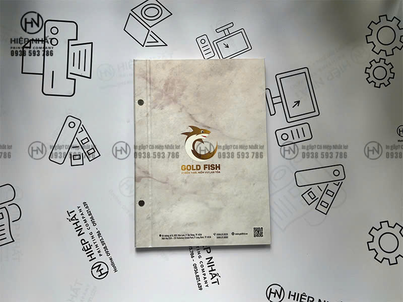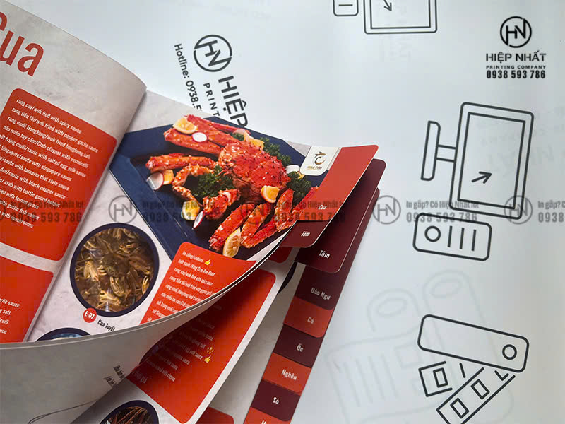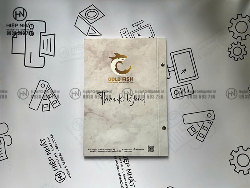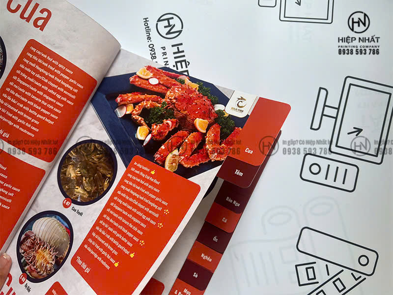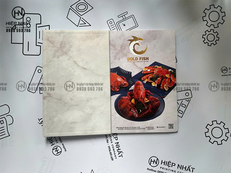 Một nhà hàng hải sản cao cấp không chỉ chinh phục thực khách bằng hương vị mà còn bằng trải nghiệm thị giác ngay từ khi cầm trên tay cuốn thực đơn. Mẫu menu bìa cứng gáy ốc ruột phân tab Gold Fish do In Hiệp Nhất thực hiện chính là minh chứng cho sự kết hợp hoàn mỹ giữa tính thẩm mỹ và độ bền bỉ.