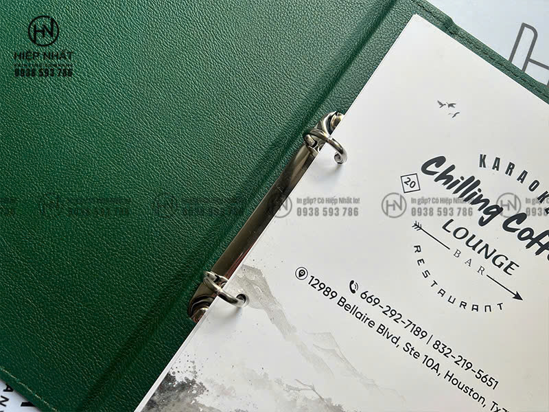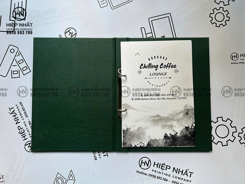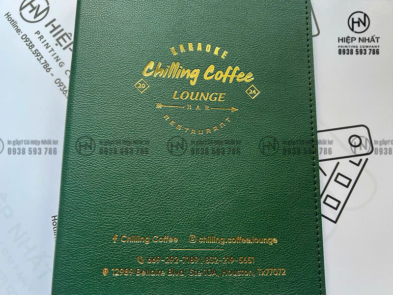 Menu bìa da ép kim gáy còng là lựa chọn phù hợp cho quán Chilling coffee lounge theo phong cách thư giãn và tinh tế. Mẫu menu do In Hiệp Nhất thực hiện sử dụng bìa da cao cấp ép kim logo, tạo điểm nhấn sang trọng, nhẹ nhàng khi cầm trên tay.