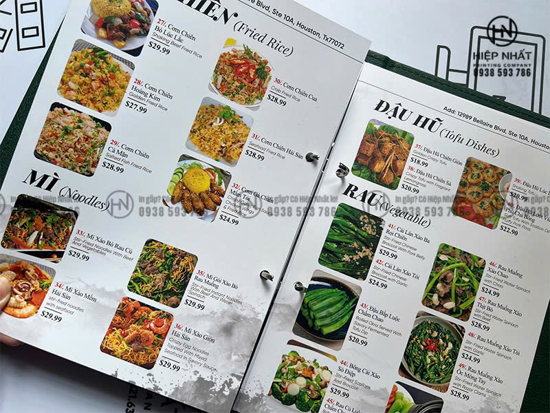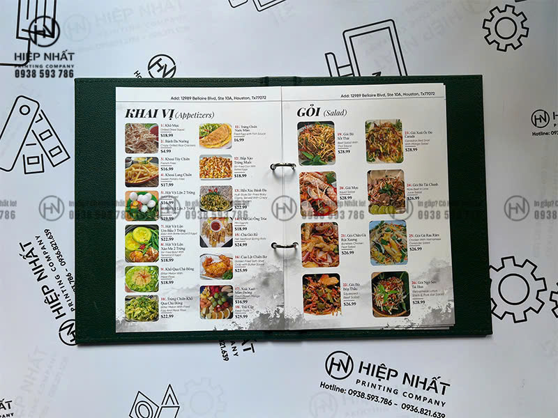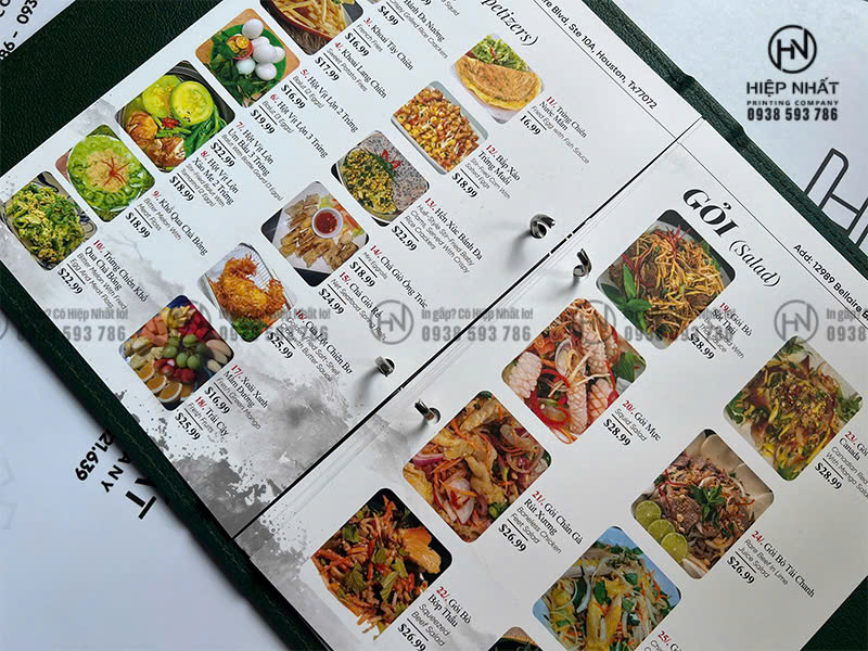 In Hiệp Nhất chuyên in ấn các loại menu theo yêu cầu cho quán ăn và nhà hàng, từ menu bìa cứng, menu da cao cấp đến các mẫu menu đóng gáy ốc, gáy còng với hình thức chỉn chu và độ bền cao.