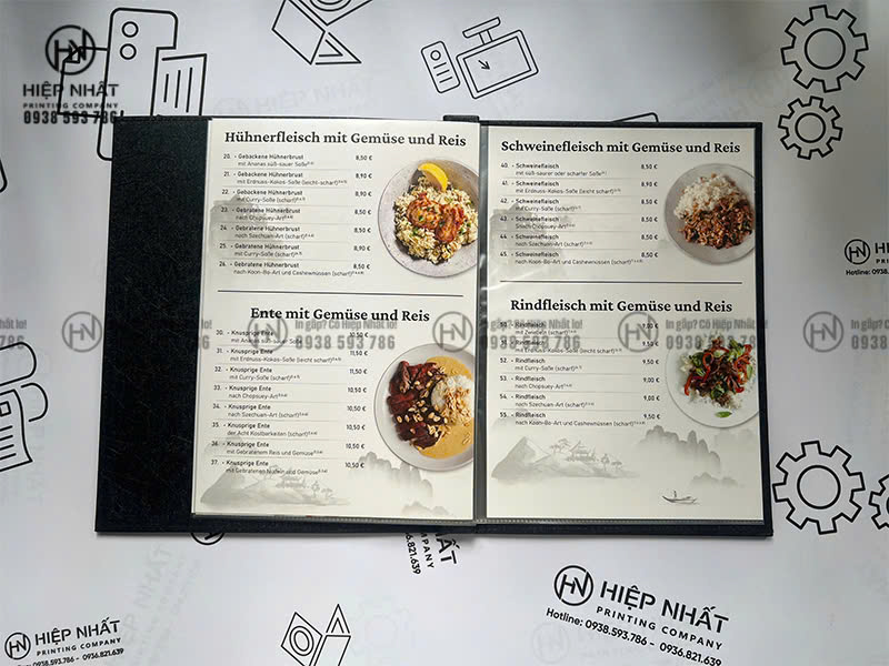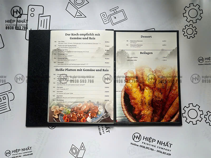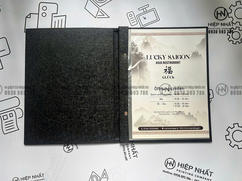 In Hiệp Nhất chuyên in ấn các loại menu theo yêu cầu cho quán ăn và nhà hàng, từ menu bìa cứng, menu da cao cấp đến các mẫu menu đóng gáy ốc, gáy còng với hình thức chỉn chu và độ bền cao.