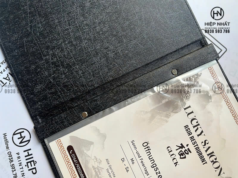 Mẫu menu bìa da gáy ốc trong vít ốc lá nhựa của Lucky Saigon Restaurant được In Hiệp Nhất in ấn theo yêu cầu, đáp ứng tốt nhu cầu sử dụng thực tế tại nhà hàng: