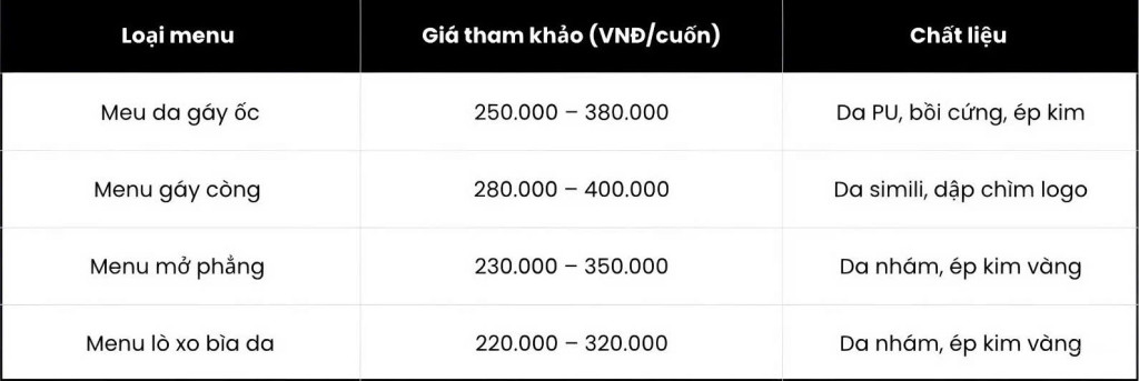 - Bìa menu: Da cao cấp, kết hợp bảng kim loại và nẹp góc chắc chắn