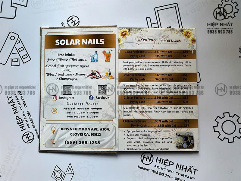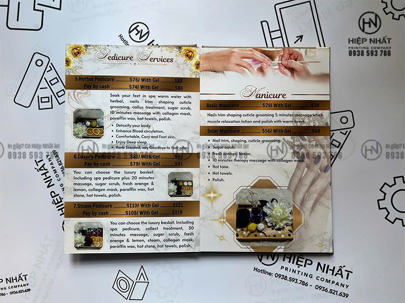 In Hiệp Nhất chuyên in ấn menu cao cấp theo yêu cầu cho nail – spa, nhà hàng và quán cà phê, từ menu bìa da, menu photobook đến các dòng menu gia công đặc biệt.