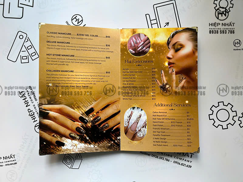 In Hiệp Nhất chuyên in ấn menu cao cấp theo yêu cầu cho nail – spa, nhà hàng và quán cà phê, từ menu bìa da, menu photobook đến các dòng menu gia công đặc biệt.