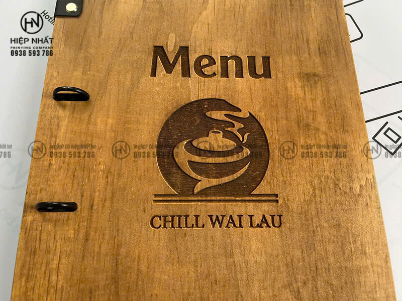 Mẫu menu bìa gỗ gáy còng in UV của Chill Wai Lau được In Hiệp Nhất sản xuất theo yêu cầu với các thông số: