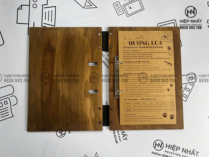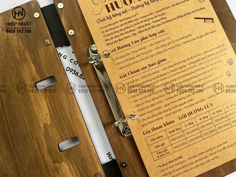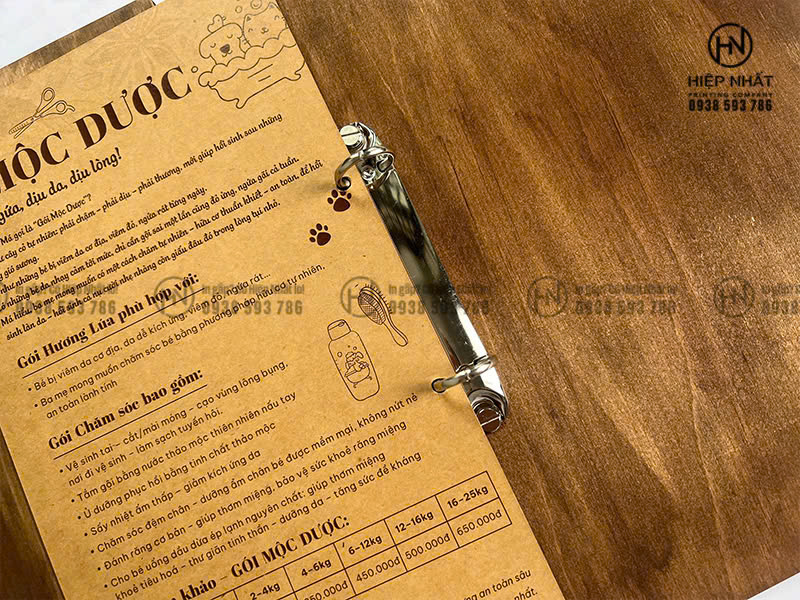 Mẫu menu bìa gỗ gáy còng của dịch vụ thú cưng tại Má Sen được In Hiệp Nhất sản xuất theo yêu cầu: