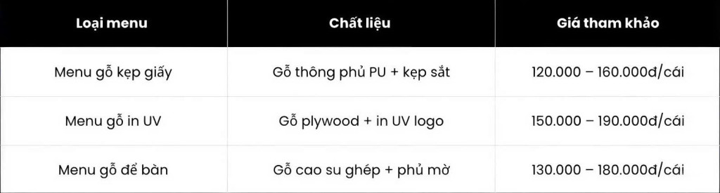 Bìa menu: Gỗ chất lượng cao, in UV trực tiếp logo và nội dung, hình ảnh rõ nét, bền màu