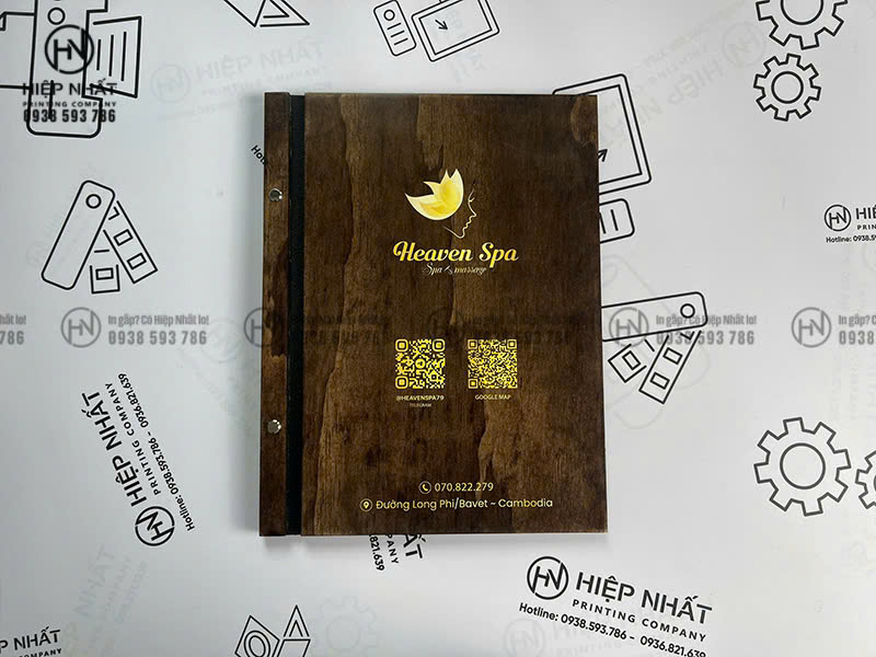 Mẫu menu bìa gỗ gáy còng in UV của Heaven Spa được In Hiệp Nhất sản xuất theo yêu cầu:
