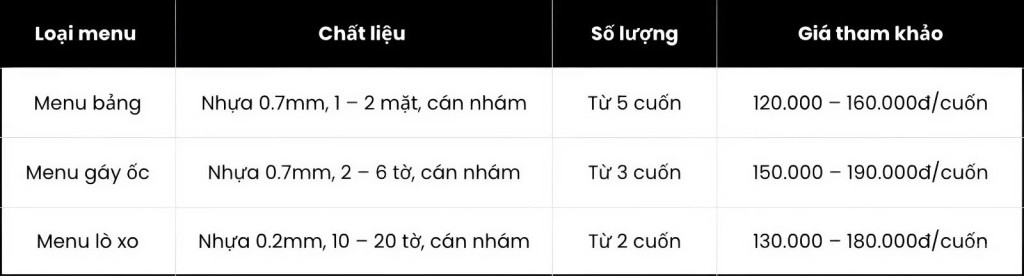 Với quy trình in nhanh, menu có thể lấy trong ngày tại TP.HCM, đồng thời hỗ trợ giao hàng toàn quốc đúng hẹn, đảm bảo chất lượng sản phẩm khi đến tay khách hàng.