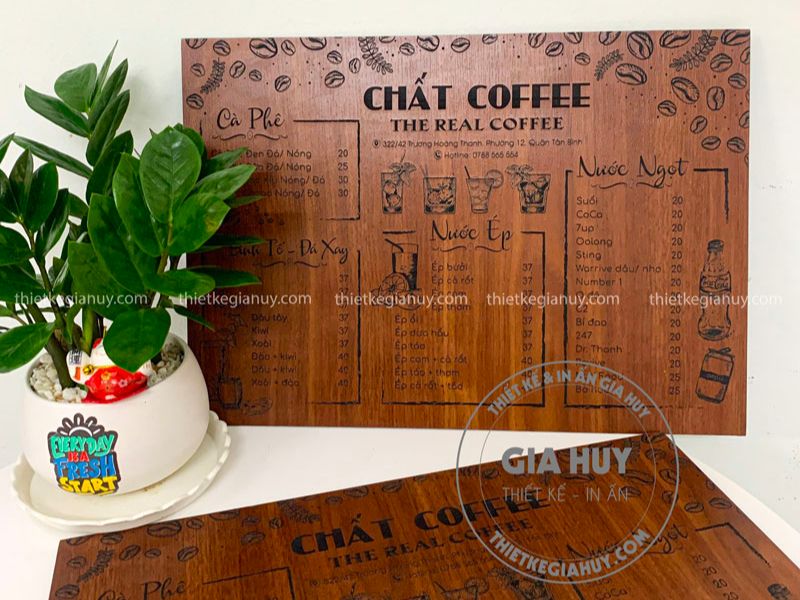 | Menu Gỗ In UV | Gỗ plywood + in UV logo | 150.000 – 190.000đ/cái |