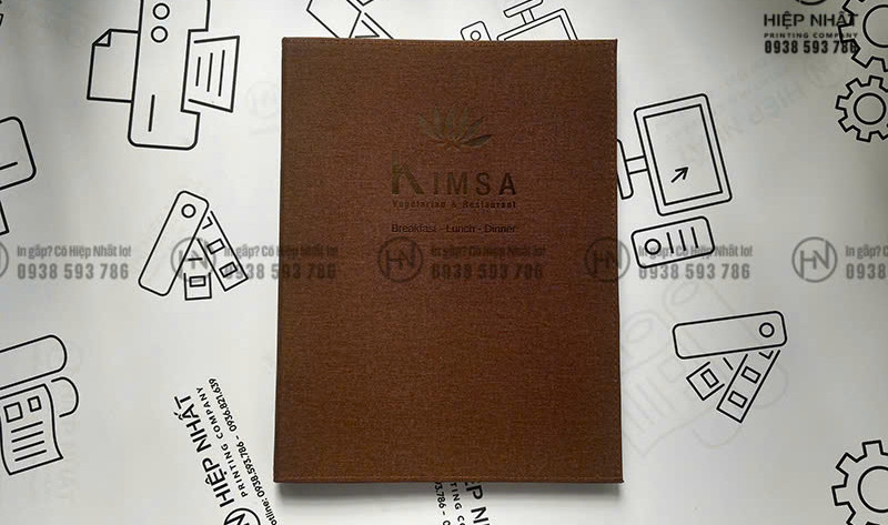 Menu bìa da gáy ốc logo dập chìm của Nhà hàng chay Kim Sa là lựa chọn phù hợp với không gian ẩm thực chay thanh…