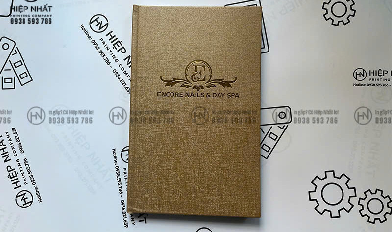 Menu bìa da photobook logo ép kim của Encore Nails & Day Spa được hoàn thiện theo hướng tinh gọn và cao cấp, phù hợp với…