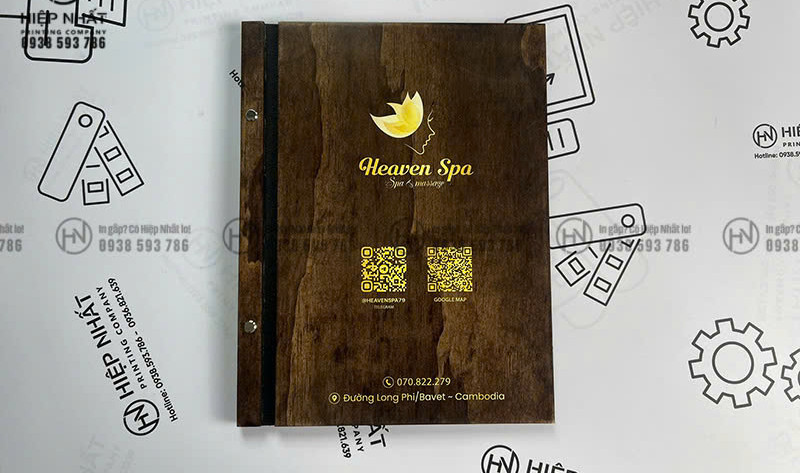 Menu bìa gỗ gáy ốc in UV của Heaven Spa được thiết kế theo phong cách tối giản và tinh tế, phù hợp với không gian…
