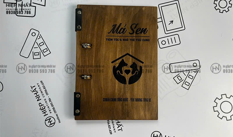 Menu bìa gỗ gáy còng in UV của dịch vụ thú cưng tại Má Sen được thiết kế theo phong cách mộc mạc, dễ thương nhưng…